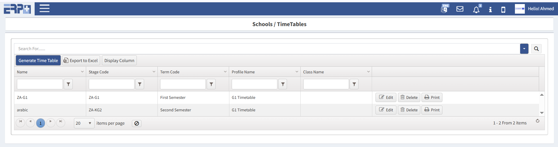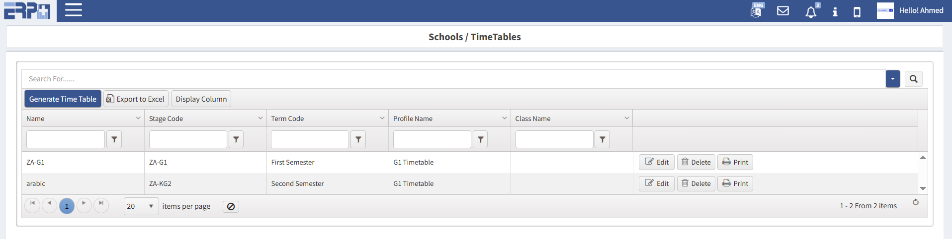 إعداد الجدول الخاص بالعام الدراسي والفصل الدراسي.