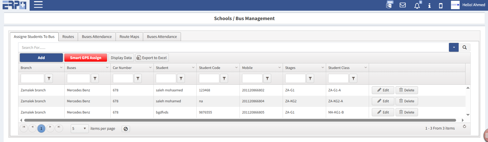 تحديد الطلاب المسجلين في الحافلة من خلال اختيارهم يدوياً، أو توفير إمكانية اختيارهم بشكل ذكي من خلال تحديد المنطقة ودخول الطلاب مع أولوية مكان التسليم حتى امتلاء الحافلة.
