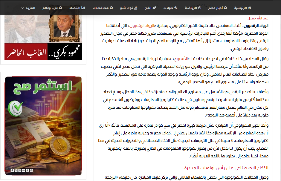 يناقش المقال المنشور في موقع "الأسبوع" أهمية مبادرة "الرواد الرقميون" التي أطلقتها الدولة المصرية بهدف تأهيل الكوادر الشابة وتعزيز مكانة مصر في مجال التصدير الرقمي وتكنولوجيا المعلومات. وفي هذا السياق، أشاد المهندس خالد خليفة، الخبير التكنولوجي، بهذه المبادرة الرئاسية الذكية، مؤكداً أنها خطوة استراتيجية لزيادة الحصيلة الدولارية ودعم الاقتصاد الوطني عبر تصدير الخدمات الرقمية، أسوة بالتجربة الهندية. وشدد "خليفة" على ضرورة التركيز على التدريب العملي في مجالات الذكاء الاصطناعي وتطوير المحتوى العربي، مشيراً إلى أن هذه الكوادر ستتمكن من العمل كمستقلين أو في شركات تصدير البرمجيات، مما يساهم في إدخال العملة الصعبة وتعزيز ريادة مصر التكنولوجية في الشرق الأوسط.