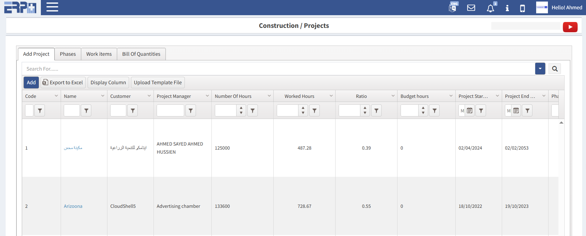 إدخال بنود العمل للمشاريع بناء على العطاء المخصص.