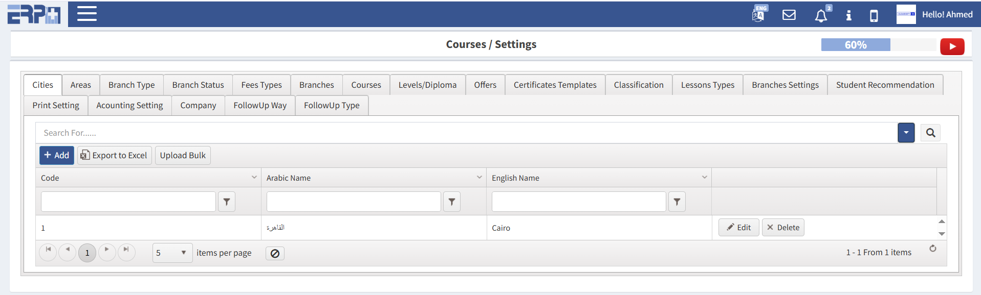 إعدادات المدن (إضافة/تحرير/حذف).