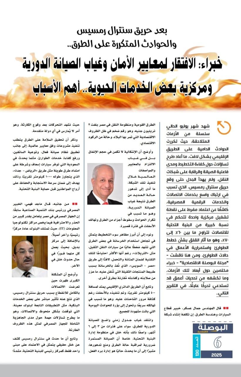 يناقش تقرير "البوصلة" أزمة حريق سنترال رمسيس وحوادث الطرق الناتجة عن غياب الصيانة ومركزية الخدمات. وأكد الخبراء أن الافتقار لمعايير الأمان وخطط الطوارئ أدى لتعطيل القطاعات الحيوية والبنوك. من جانبه، أوضح المهندس خالد خليفة أن انهيار الاتصالات سببه الاعتماد على نقطة مركزية واحدة بلا بدائل. ودعا لتوزيع مراكز البيانات، وفصل الشبكات جزئياً، وعقد شراكات دولية لتحديث البنية التحتية وتأمينها.