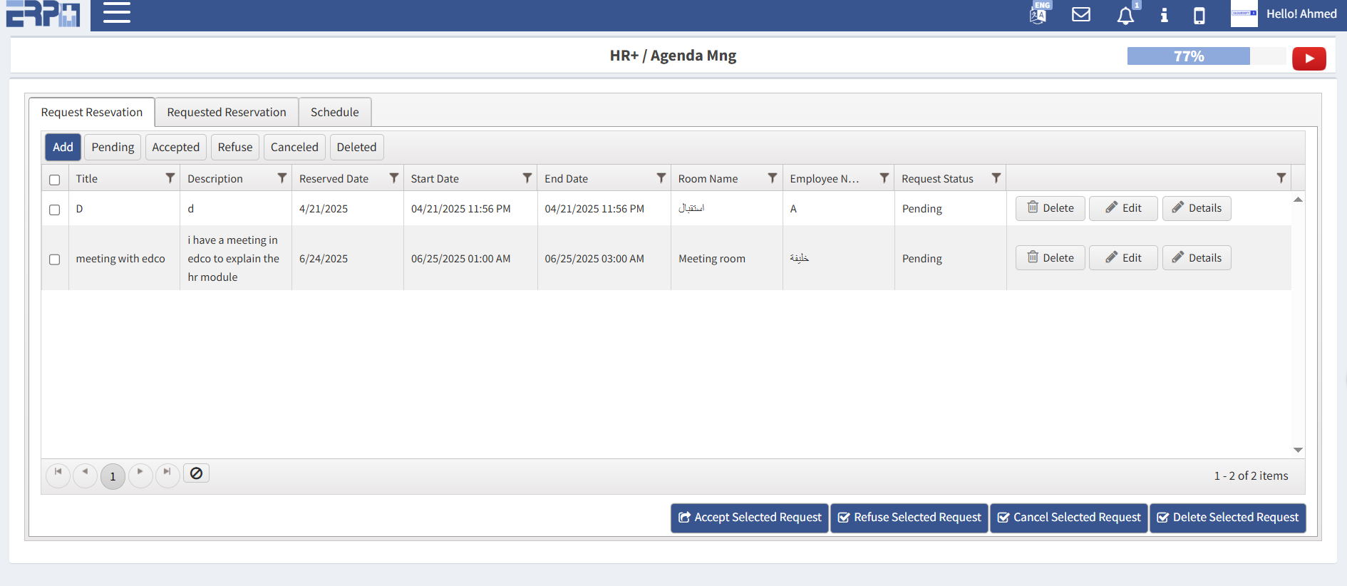 Meeting management to reserve or book meeting rooms with attendees list, meeting objectives, and other details.