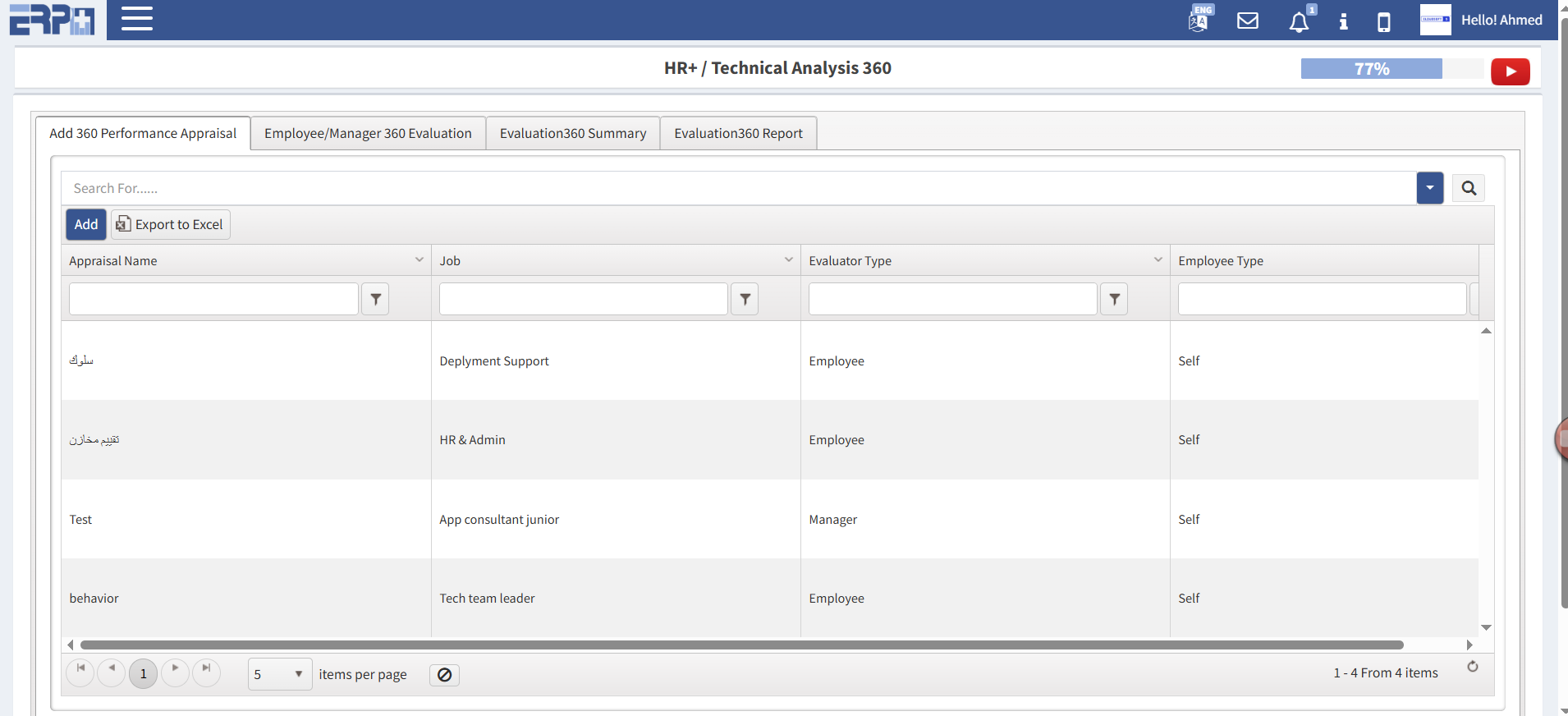 Targets and objectives management of employees (add objectives, employee decision, manager decision, objectives evaluation).